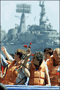 Familiares de detenidos desaparecidos arrojando flores al mar. La actuación