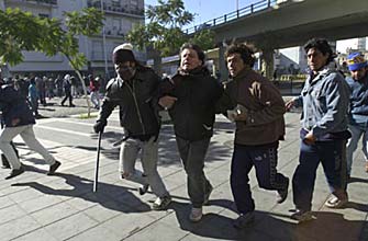 | DESBANDE. Darío Santillán, con un palo, pasamontañas y gorra con ribete blanco, acompaña a un herido por Avenida Mitre hacia Pavón, en el inicio de los incidentes bajo el Puente Pueyrredón. |