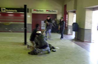 | AYUDA. A 4 cuadras del Puente, en el hall de la estación de trenes, Santillán intenta asistir su compañero muerto, Maximiliano Kosteki, junto a otro manifestante. |