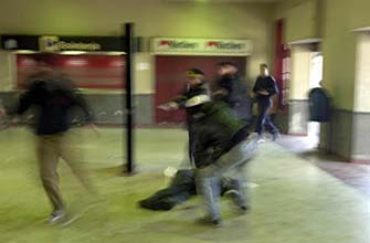| HACIA AFUERA. Con apuro, los policías ya llevan colgando a Santillán dentro del hall. Van hacia la Avenida Pavón y pasan junto a Kosteki, que antes había caído muerto. |