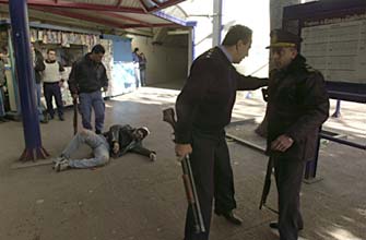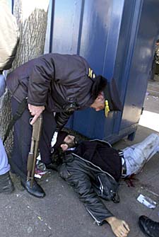| JUNTO AL QUIOSCO. El comisario toca a Santillán, tirado sobre la vereda de Pavón. Esta inmóvil, con los ojos cerrados y sobre una mancha de sangre que sale de su cintura |